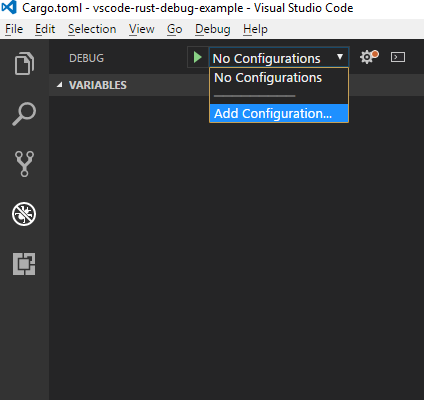 Debugging in VSCode is configured from the debug view, which we can get to by clicking on the bug icon, or via Ctrl + Shift + D. In this view there is a drop down box to select or add a launch configuration: