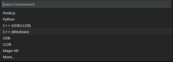 From there we're given a drop down menu offering a number of debug configurations. For MSVC rust debugging we want C++ (Windows).