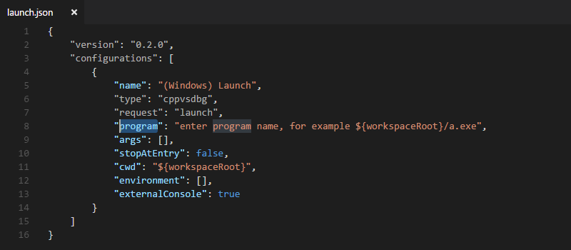 Now we're presented with a newly created launch.json file, which contains a skeleton debug config. There are various settings that can be tweaked here, but the only one that really needs to change is the program which needs to be set to the program to debug.